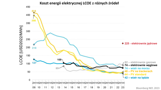 Średnie koszty produkcji energii elektrycznej w latach 2009–2023. Źródło: Bloomberg NEF, 2023