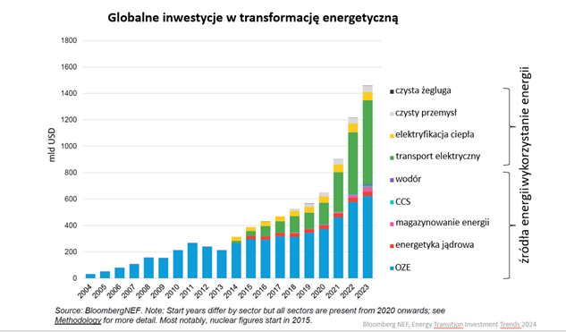 Światowa Gospodarka wykładniczo zwiększa nakłady na transformację energetyczną. Wśród tych nakładów znajdujemy także te na EJ, przy czym utrzymują się one na stałym poziomie. W 2023 roku stanowiły one zaledwie około 5% nakładów na OZE i 2% całości nakładów na transformację energetyczną.