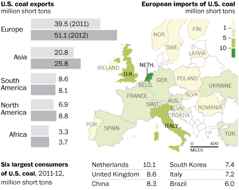 Wzrost zużycia węgla w Europie jest w głównej mierze spowodowany przez spadek jego udziału w amerykańskim bilansie energetycznym. W USA panuje obecnie boom łupkowy, a niskie ceny gazu (według wielu źródeł nawet poniżej kosztów jego wydobycia) sprzyjają wzrostowi udziału gazu w miksie energetycznym – spadł więc popyt na węgiel. Amerykańskie kopalnie starają się utrzymać eksportując swój węgiel m.in. do Europy – w pierwszych dziewięciu miesiącach 2012 roku eksport ten był aż o 26% wyższy niż rok wcześniej.