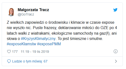 Posłanka Zielonych Małgorzata Tracz skrytykowała obóz rządzący pisząc, że do tej pory nie pomagał w spopularyzowaniu OZE w Polsce. W expose według niej usłyszeliśmy jedynie “puste frazesy”.