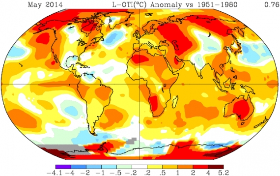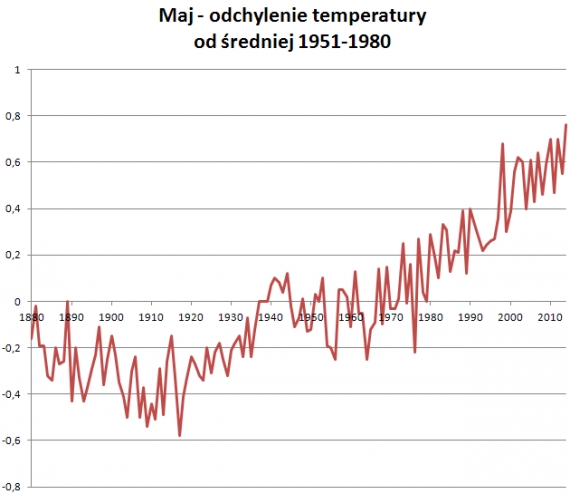 Według NASA GISS obecny maj był najcieplejszy w historii pomiarów i to aż o 0,06 stopnia, z wartością anomalii 0,76 C wobec okresu bazowego 1951-1980.