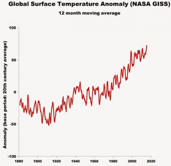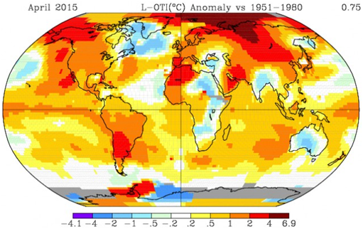 Jest coraz bardziej prawdopodobne, że 2015 rok będzie najgorętszym w historii pomiarów. 13 maja 2015 r. NASA poinformowała, że okres od stycznia do kwietnia 2015 okazał się najcieplejszym okresem w historii pomiarów, od 1880 roku. Warto zaznaczyć, że licząc od przełomu XIX/XX wieku świat jest już praktycznie o 1oC cieplejszy, zbliżając się do temperatur z interglacjału eemskiego 120 tysięcy lat temu.