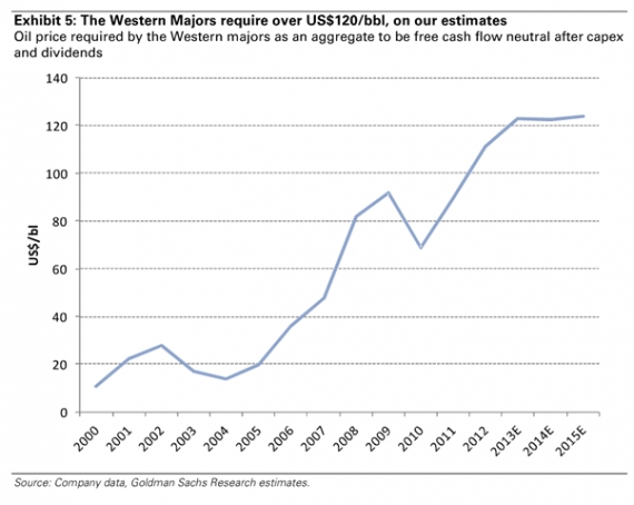 Zachodnie firmy naftowe w latach 2008-2011 dla zbilansowania przepływów pieniężnych (wraz z kosztami kapitałowymi i dywidendami) potrzebowały cen ropy na poziomie 80$/b. Obecnie progiem opłacalności jest już 120$/b.