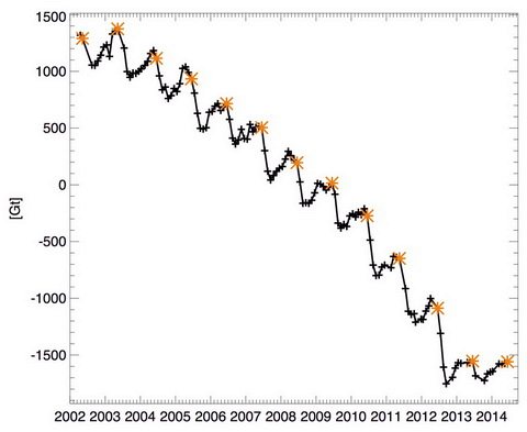 Rysunek 4. Odchylenie masy lądolodu Grenlandii (w mld ton) od średniej z lat 2002-2014 na podstawie pomiarów satelitów GRACE. Pomarańczowe gwiazdki pokazują wartości dla czerwca. NOAA Arctic Report Card 2014.