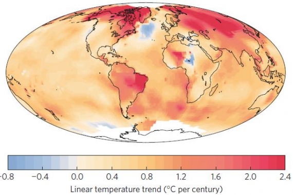 Rysunek 1. Liniowy trend wzrostu temperatury w okresie 1900-2013. Na tle ogarniającego całą kulę ziemską ocieplenia, ochłodzenie subpolarnego Północnego Atlantyku jest szczególne wyraźne i dobrze udokumentowane licznymi pomiarami – w odróżnieniu od niewielkiego obszaru w Afryce Północnej, który uważa się za artefakt niekompletnych i niejednorodnych danych pomiarowych ze stacji meteorologicznych.