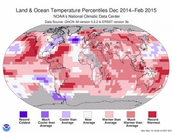 Rysunek 5. Odchylenie temperatur zimą (grudzień 2014-luty 2015) od średniej z okresu 1961-1990. NOAA.