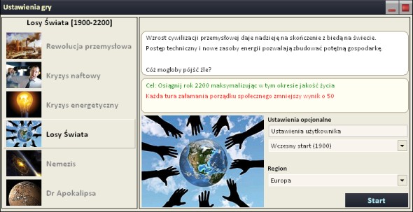 Możesz rozpocząć grę w 1900 roku. Zauważysz, że gra Europą czy Ameryką Północną bardzo różni się od gry Afryką czy Indiami. Możesz też zacząć rozgrywkę we współczesności, starając się zażegnać serię zbliżających się kryzysów. Możesz próbować oprzeć system energetyczny na paliwach kopalnych, energii jądrowej lub odnawialnych źródłach energii. Możesz sprawdzić skuteczność strategii szybkiego wzrostu gospodarczego i rozwoju technologii. Możesz też zagrać w scenariusz, w którym musisz utrzymać szybki wzrost gospodarczy przez stulecia i zbudować potężną gospodarkę, by zapobiec uderzeniu w Ziemię wielkiej asteroidy. A jeśli jesteś socjopatą, który marzy o eksterminacji ludzkości i życia na Ziemi, również znajdziesz scenariusz dla siebie.