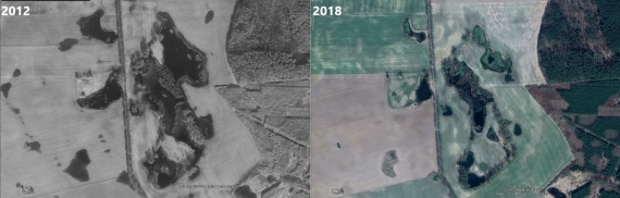 Rys. 1. Stawy krężelińskie w województwie zachodniopomorskim. Po lewej: stan na 2012 rok, po prawej: rok 2018.