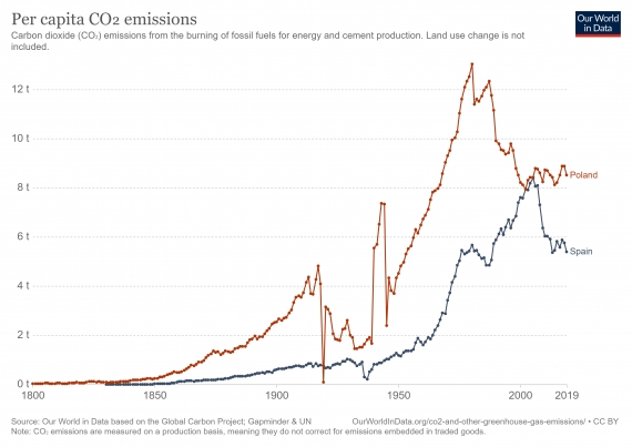 Ilustr.3: Zmiany w emisji dwutlenku węgla w Hiszpanii i w Polsce w przeliczeniu na mieszkańca (lata 1960-2019). Źródło: Our World In Data.