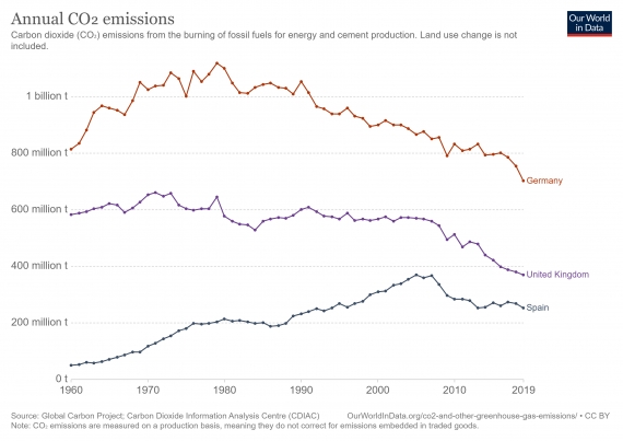 Ilustr.2: Zmiany w emisji dwutlenku węgla w Hiszpanii, Niemczech i Wielkiej Brytanii (lata 1960-2019). Źródło: Our World In Data.