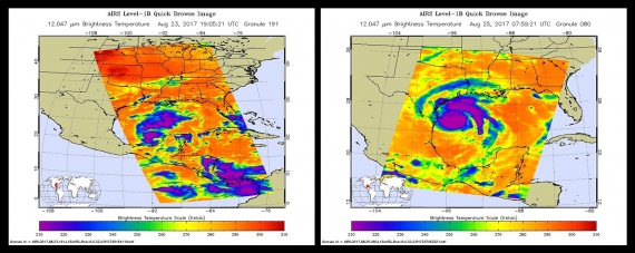 Rysunek 3. Ewolucja huraganu Harvey widoczna na zdjęciach satelitarnych NASA. Zdjęcia pochodzą z przelotów satelity Aqua 23 sierpnia (po lewej) i 25 sierpnia (po prawej) 2017. Skala kolorystyczna odpowiada tzw. temperaturze emisyjnej (w kelwinach), czyli temperaturze ustalonej na podstawie ilości promieniowania emitowanego przez fotografowane obiekty (górną granicę chmur). Można zauważyć, jak ciągu 36 godzin układ chmur sygnalizujący obecność niżu zorganizował się w postaci spirali. Obrazy zamieszczamy dzięki uprzejmości NASA/JPL-Caltech.
