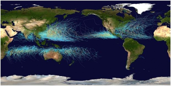 Rysunek 2. Trasy cyklonów w latach 1851-2006. Cyklony tropikalne najczęściej rozwijają się na przełomie lata i jesieni, co jest związane z najwyższą temperaturą powierzchni wód w tym okresie oraz odsunięciem się polarnych prądów strumieniowych w kierunku biegunów. Na przykład na Atlantyku 96% huraganów o sile wiatru przekraczającej 50 m/s (180 km/h) pojawia się między sierpniem a październikiem (źródło: Wikipedia, na podstawie danych NOAA).