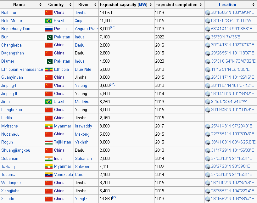 Ilustr. 3. Chiny prowadzą bezprecedensową budowę tam. Lista pokazuje 24 największe budowane na świecie tamy. 13 jest w Chinach. (kliknij, aby powiększyć) Źródło: Wikipedia