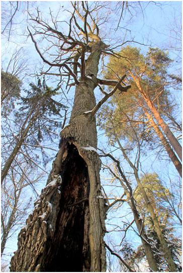 Rys. 3. Stare drzewo w polskiej części Puszczy Białowieskiej – ostatnim naturalnym lesie nizinnym w Europie. Las ten zamieszkują żubry, wilki, rysie, dzięcioły inne rzadkie ptaki, rośliny i grzyby.