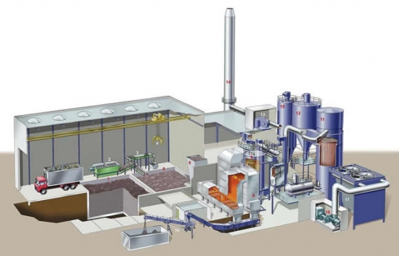 Rysunek 1. Schemat elektrowni wykorzystującej proces pirolizy. Proces pirolizy służy do produkcji czystego, wysokoenergetycznego gazu z homogenicznych odpadów i strumieni biomasy.