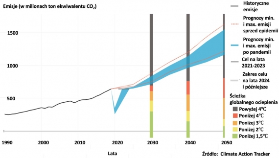 Jak wyjaśnia Climate Action Tracker, prognozy sprzed pandemii wskazywały, że emisje z lotnictwa mogą sięgnąć w 2050 r. nawet między 1,22 a 1,63 mld ton ekwiwalentu CO2 (GtCO2e). Już po nadejściu COVID-19 prognozy te zmniejszono, ale nieznacznie, bo do 1,16-1,55 GtCO2e. Tymczasem żeby być w zgodzie z wytycznymi zawartymi w Porozumieniu Paryskim, emisje w 2030 r. powinny zmniejszyć się do 0,3 GtCO2e, a w 2060 r. – do zera. Nic więc dziwnego, że Climate Action Tracker ocenia plany branży jako „krytycznie niewystarczające”.