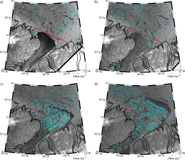 Łuki lodowe wyglądają jak mosty po bokach, które blokują ruch lodu z północy na południe. Problem polega na tym, że twory te rozpadają się coraz wcześniej, co umożliwia przepływ większej ilości lodu przez Cieśninę Naresa. Dzieje się to nie tak jak kiedyś latem, a już nawet wiosną. A jak pokazuje powyższe zestawienie map – jeszcze w trakcie sezonu zamarzania. Z obserwacji wynika, że co roku łuki lodowe rozpadają się średnio o tydzień wcześniej niż w roku ubiegłym. Zator lodowy jest coraz cieńszy, bariera staje się słabsza, co prowadzi do zmian dalej na północy – szacuje się, że ruch lodu w obszarze ostatniego bastionu lodu rośnie dwa razy szybciej niż w pozostałej części Arktyki.