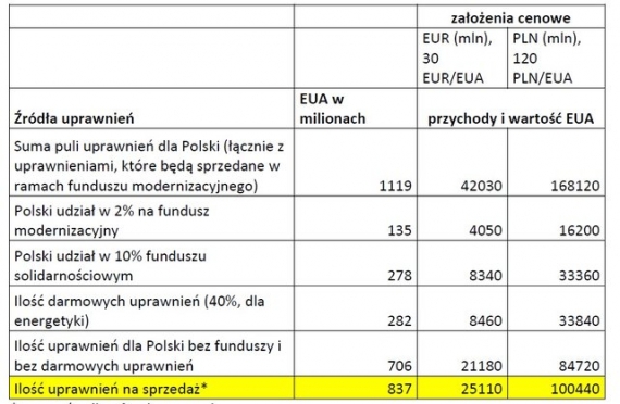 Tabela 2. Ilość, źródła i wartość uprawnień do emisji (EUA) należących do Polski w ramach nowego pakietu