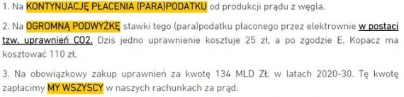 Niestety miejsca pracy w górnictwie (przypuszczam, że do nich się odnosi powyższy obrazek) zostaną utracone nie ze względu na to, że prowadzona jest polityka klimatyczno-energetyczna w UE, ale dlatego, że polskie górnictwo jest nierentowne. Rynek węgla kamiennego jest bowiem globalny i w pełni konkurencyjny. Jedynym sposobem na to, żeby „ratować” miejsca pracy nie jest wetowanie unijnej polityki klimatycznej, lecz skorzystanie z niej w celu stworzenia nowych miejsc pracy w sektorach przyszłościowych i innowacyjnych. Pomijając ważne kwestie środowiskowe, bezpieczeństwa energetycznego i zdrowotne, po to właśnie jest ten „(para)podatek” i dlatego właśnie UE widzi przyszłość w odchodzeniu od sektorów schyłkowych na rzecz nowych i perspektywicznych.