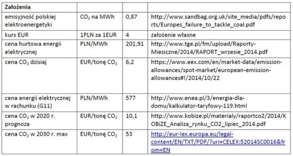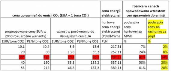 Tabela 1. Analiza wzrostu cen energii elektrycznej w wyniku przyjęcia pakietu klimatyczno-energetycznego do roku 2030 i wzrostu cen uprawnień do emisji CO2 (jednostki EUA) w wariancie pesymistycznym (bez działań na rzecz zmiany miksu energetycznego w Polsce i przy wysokiej cenie EUR)
