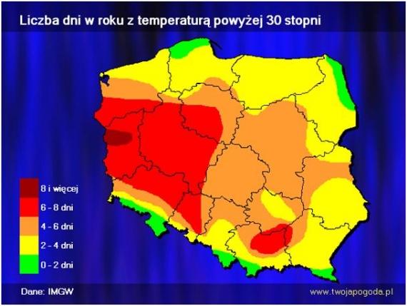 Rys. 2. Liczba dni z temperaturą przekraczającą 30C w okresie 1951-2000.