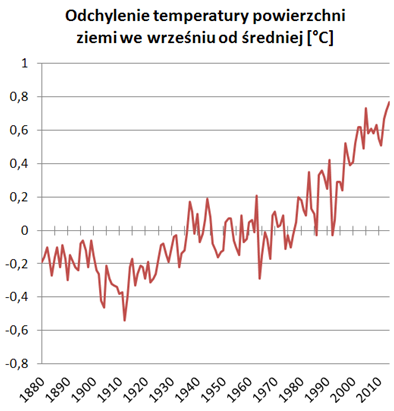 Warto podkreślić, że ta przeciągająca się seria rekordów ma miejsce w czasie, kiedy naturalne zjawiska nie sprzyjają wysokim temperaturom powierzchni Ziemi: aktywność słoneczna wciąż nie należy do najwyższych a na Pacyfiku nie rozwinęło się na razie zjawisko El Niño. Dlaczego zwracamy na to uwagę? Dlatego, że dotąd rekordowo wysokie temperatury odnotowywano najczęściej podczas El Niño, czyli wtedy, gdy wody Pacyfiku są znacznie cieplejsze od średniej (czytaj więcej: MIT: Za globalne ocieplenie odpowiada El Niño). Ani w latach 90-tych, ani wcześniej temperatura nie była wyższa od średniej o więcej niż 0,5oC, z wyjątkiem roku 1997 (najsilniejsza w historii anomalia El Niño). Od ponad 20 lat nie zanotowano też, by wrzesień był chłodniejszy od średniej z okresu 1951-1980, jak miało to miejsce ostatni raz w 1992 roku.