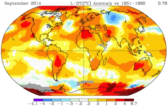 Rysunek 2. Wrześniowe odchylenie temperatury powierzchni Ziemi od średniej z okresu bazowego 1951-1980. Źródło: NASA GISS.