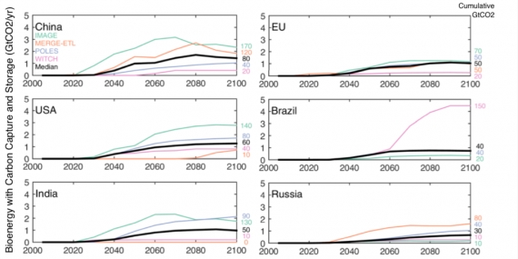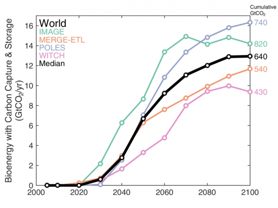 Powyższy wykres ilustruje symulacje opłacalnych ekonomicznie opcji łagodzenia zmian klimatu w różnych IAM. BECCS rozpoczyna się już w 2020 roku i osiąga 10 do 20 Gt CO2 rocznie (25-50% obecnych rocznych emisji) w 2100 roku, tym samym pochłaniając do 2100 roku od 400 do 800 GtCO2 – wielkość porównywalna z okresem 12-22 lat obecnych rocznych emisji. Obszary lądowe będą wymagać do takiej skali CDR powierzchni Indii, a nawet większej.