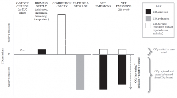 CO2 pochodzący ze spalania biomasy jest obecnie traktowany neutralnie pod względem emisji dwutlenku węgla do atmosfery przez sektor energetyczny (białe słupki). Emisje CO2 w zakresie bioenergii pojawiają się tylko w sektorze gruntów, jeśli nastąpią zmiany w zasobach węgla na lądzie (pokazane na rysunku zero). Ponadto sektor gruntów obejmuje inne działania oprócz bioenergii, które mogą maskować zmiany w użytkowaniu terenu związane z bioenergią. Kolejną komplikacją jest to, że emisje CO2 związane z dostarczaniem biomasy (czarny słupek) mogą być liczone jako pochodzące z sektora energetycznego, jeśli jest on oparty na wykorzystaniu paliw kopalnych. Tak więc emisje związane z produkcją i transportem biomasy wlicza się w całkowite zużycie paliw kopalnych. I w końcu CO2 wychwycony i zmagazynowany z bioenergii (szary pasek) jest liczony osobno, ale jednocześnie łączy się go ze wszystkimi formami CCS.