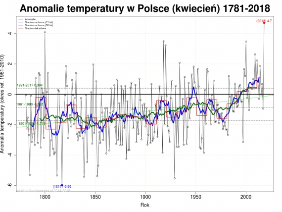Dlatego spójrzmy teraz na cały kwiecień. I co się okazało? Anomalia temperatury kwietnia 2018 (średnia obszarowa) osiągnęła +4.70°C (okres referencyjny 1981-2010) i była wyższa od rekordowej wartości z roku 1800 aż o 0.62°C. Tym samym padł 218. letni rekord, który wydawał się jak do tej pory niemal nie do pobicia. W tym miejscu należy jednak zauważyć, że średnia anomalia kwietnia 1800 była najprawdopodobniej nieco przeszacowana.