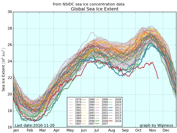 Czy utrata lodu morskiego w Arktyce jest kompensowana wzrostowi powierzchni lodu morskiego wokół Antarktydy, którego powierzchnia do niedawna wzrastała mimo postępującego ocieplenia klimatu? Bynajmniej, od września b.r. powierzchnia ta zaczęła spadać w nietypowy sposób i w efekcie nigdy w połowie listopada lodu wokół Antarktydy nie było tak mało jak obecnie.