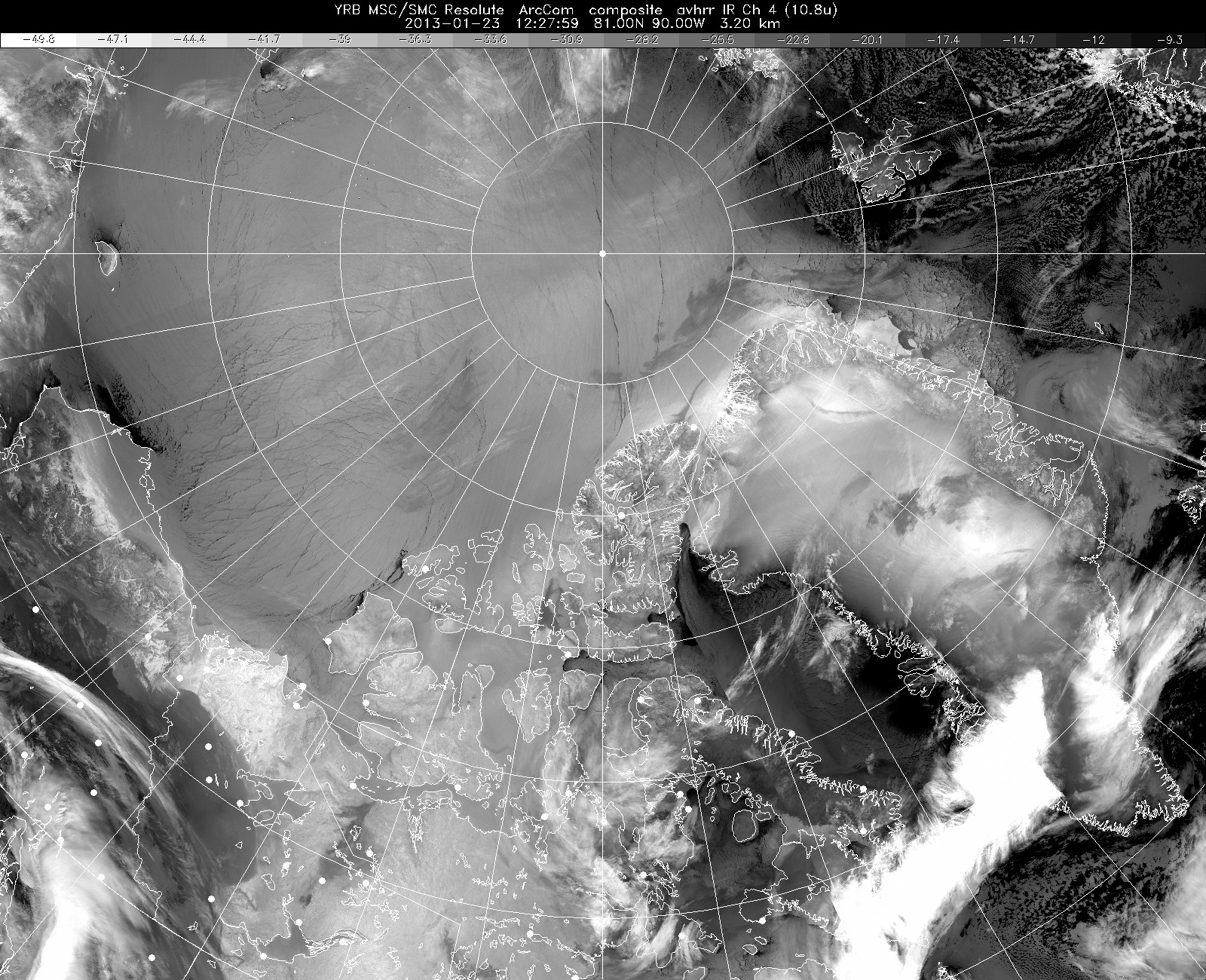 Obecnie zdjęcia satelity Terra-Modis nie obejmują obszaru Oceanu Arktycznego ze względu na noc polarną. Istnieją jednak możliwości wykonywania zdjęć w podczerwieni, dzięki czemu można zobaczyć pokrywę lodową w okresie nocy polarnej. Są także dostępne kolorowe zdjęcia koncentracji kriosfery na stronach takich jak Crysphere Today, ale nie oddają one w pełni obrazu lodu arktycznego. Poniższe zdjęcie (kliknij aby powiększyć) ukazuje prawdziwy obraz lodu arktycznego o tej porze roku.