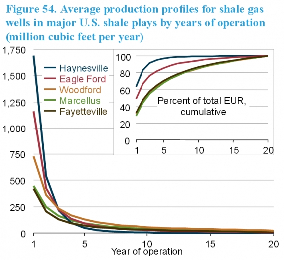 Rysunek 1. Spadek wydobycia z odwiertów gazu łupkowego dla różnych regionów wydobycia w USA. Źródła : Rys. 54 EIA Annual Energy Outlook 2012