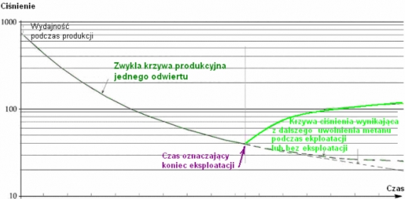 Rysunek 2. Zmiany ciśnienia w złożu gazu łupkowego. Po zakończeniu eksploatacji i zaczopowaniu odwiertu ciśnienie w złożu zaczyna rosnąć.