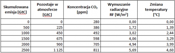 Poniżej znajduje się tabela z wynikami obliczeń, które są bardzo proste. Przykładowo, jeśli od początku epoki przemysłowej do pewnego momentu wyemitowano 500 GtC (co odpowiada 1833 mld ton CO2), w atmosferze pozostało 45% wyemitowanego CO2, czyli 225 GtC. Spowodowało to wzrost koncentracji CO2 w atmosferze o 225/2,12=106 ppm, czyli do poziomu 386 ppm. Takiemu stężeniu CO2 odpowiada wzrost wymuszania radiacyjnego o 5,35•ln (386/280) = 1,72 [W/m2]. Oczekiwana w takim wypadku zmiana temperatury wyniesie więc 3•1,72/3,7=1,39 [°C].