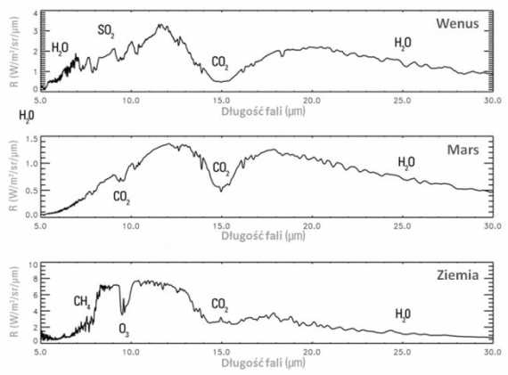 Rysunek 2: Spektrum promieniowania Wenus, Marsa i Ziemi. David Grisp (Jet Propulsion Laboratory/CIT), „Understanding the Remote-Sensing Signatures of Life in Disk-averaged Planetary Spectra: 2”