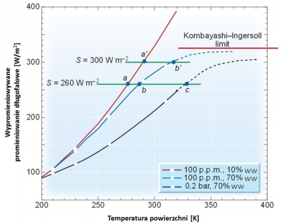 Przy wyższej wilgotności (linia niebieska), wzrost temperatury wyniesie już aż 30 K. Tak właśnie manifestuje się sprzężenie zwrotne pary wodnej. Jego ostatecznym wcieleniem jest rozbuchana szklarnia – wzrost temperatury powoduje tak intensywne parowanie i szybki przyrost ilości pary wodnej w atmosferze, że ilość wypromieniowywanej w przestrzeń kosmiczną energii przestaje rosnąć – to tzw. „granica Kombayashiego-Ingersolla”. Planeta z wilgotną atmosferą nie może wypromieniować w podczerwieni więcej energii.