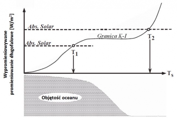 Rysunek 4. Jakościowy schemat znikania oceanu podczas przechodzenia przez planetę procesu rozbuchanej szklarni. (R. Pierrehumbert, Principles of Planetary Climate, Rozdz. 4.3).