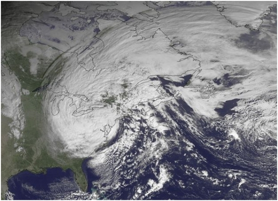 To zdjęcie satelitarne NOAA z wtorku 30 października pokazuje supersztorm Sandy z centrum nad stanem Pennsylvania. Poza olbrzymimi spustoszeniami wybrzeży kilku stanów a zwłaszcza New Jersey i Nowy Jork, sztorm spowodował ponad 30-centymetrowe opady śniegu w stanie West Virignia. Na większych wysokościach spadło ponad 60 cm śniegu.