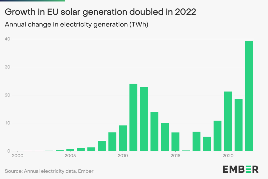 Imponujący przyrost energii produkowanej ze słońca w UE. Źródło: Ember.