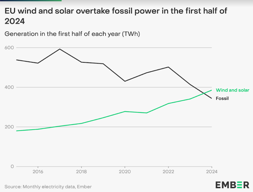 W I poł. 2024 r. już 13 państw członkowskich wytworzyło więcej energii elektrycznej z wiatru i słońca niż z paliw kopalnych. Cztery z nich dokonały tego po raz pierwszy. To Belgia, Węgry, Holandia i wywoływane często do tablicy Niemcy.