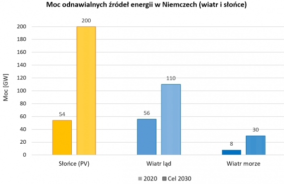Ilustracja 1. Zestawienie aktualnych mocy energetyki wiatrowej i słonecznej z planami na 2030 r. Moc wiatru na lądzie (110 GW) to oszacowanie bazujące na planach zainstalowania farm wiatrowych na 2% powierzchni kraju.