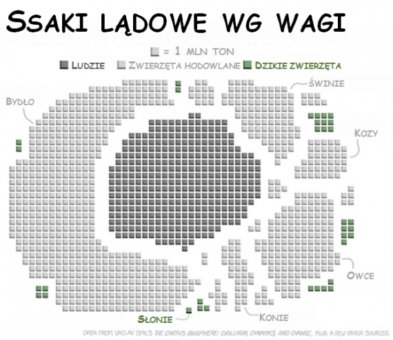 Waga Homo Sapiens to obecnie 28% całości wagi ssaków lądowych. Nasze zwierzęta hodowlane to kolejne 69%. Na całą resztę przypada już tylko 3% (i maleje). Warto zauważyć, że dotyczące liczby ludzi i masy dzikich zwierząt dane Smila pochodzą z 2000 roku – od tego czasu liczebność Homo Sapiens i ich inwentarza wzrosła, liczba zwierząt zaś spadła – tak więc stosunek tych liczb to obecnie nie 30:1, lecz raczej 50:1. Przy obecnych trendach do połowy stulecia może to być 100:1.