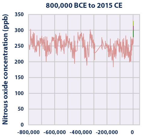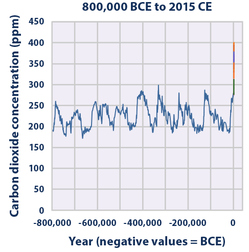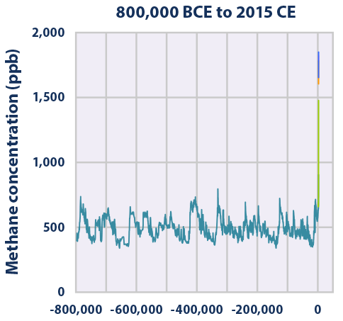 Rysunek 2. Zmiany stężeń CO2, CH4 i N2O w ostatnich 800 000 lat. BCE oznacza lata p.n.e.. Źródło EPA