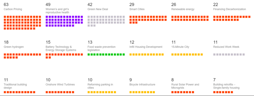 Na liście 64 rozwiązań znajduje się 15, które przesunęłyby Dzień Długu Ekologicznego o przynajmniej 10 dni. Oprócz wspomnianej trójki największy wpływ na odroczenie terminu spłaty miałyby inteligentne miasta (29 dni), rozwój odnawialnych źródeł energii (26 dni) i finansowanie odchodzenia od paliw kopalnych (22 dni).