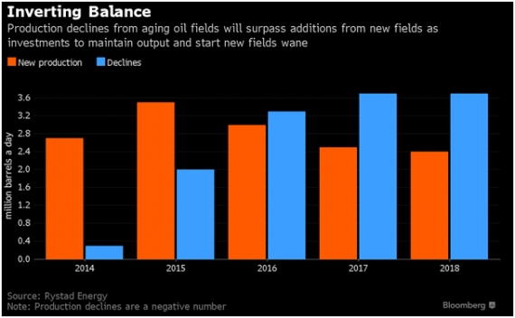 Rysunek 2. Zestawienie nowych mocy wydobywczych i spadku wydobycia z pól naftowych. Analiza Rystad Energy pokazuje, że po 2016 roku świat czeka spadek wydobycia ropy.