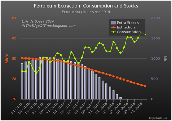 Rysunek 3. Zestawienie prognozowanego zapotrzebowania na ropę (zielona linia), wydobycia (pomarańczowa linia) i wynikająca z tego bilansu zmiana zapasów ropy.