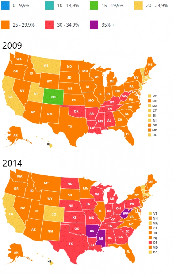 Rysunek 2: Odsetek osób ze współczynnikiem BMI (Body Mass Index) powyżej 30 w poszczególnych stanach USA w roku 2009 i 2014. Źródło: State of Childhood Obesity