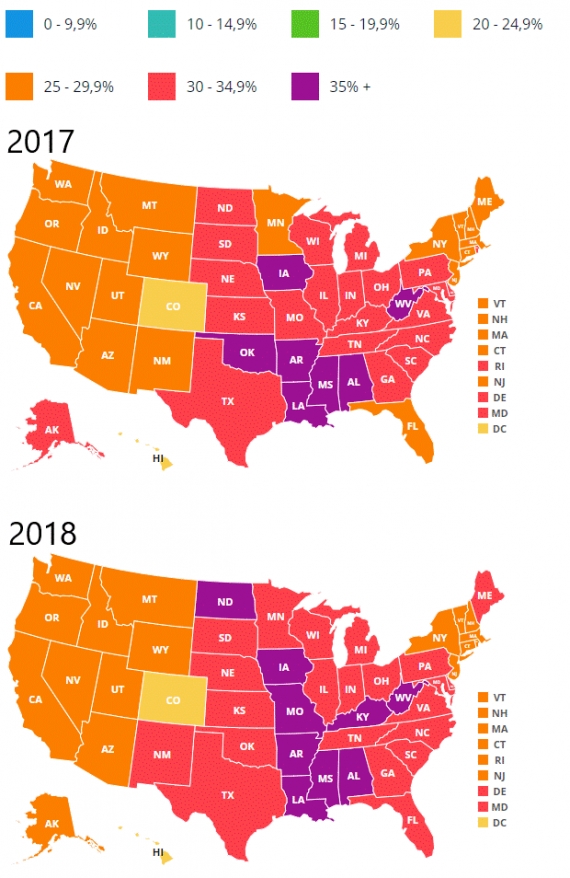 Rysunek 3: Odsetek osób ze współczynnikiem BMI (Body Mass Index) powyżej 30 w poszczególnych stanach USA w roku 2017 i 2018. Źródło: State of Childhood Obesity