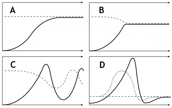 Rysunek 3. Adaptacja gatunku do podwyższonej pojemności środowiska może zachodzić w rożny sposób. W scenariuszu A populacja powoli rośnie aż do pełnego wypełnienia własnej niszy ekologicznej. Scenariusz B zakłada, że gatunek ma tendencję do pogarszania stanu swojego środowiska w miarę wzrostu liczebności – po zbliżeniu się do maksymalnej pojemności ekosystemu wzrost populacji szybko hamuje. Krzywa C jest charakterystyczna dla gatunków, które dominują we własnym środowisku, a ponadto są w stanie „kraść zasoby z przyszłości” – tak jak lemingi pożerają młode pędy zanim te się rozwiną. W wariancie C pojemność środowiska zależy od historycznej populacji. Krzywa D jest charakterystyczna dla gatunków eksploatujących nieodnawialne surowce. Korzystanie z martwej materii organicznej pozwala stworzyć „tymczasową pojemność środowiskową” i na okres kilku pokoleń powiększyć populację (lub standard życia) znacznie powyżej pojemności środowiskowej.